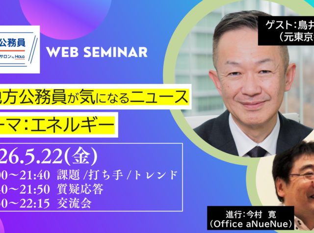 本日は5月22日に行われる地方公務員オンラインサロン開催のイベントの紹介です。 その道の専門の方々にニュースの共有と考察をして投稿いただく「#地方公務員が気になるニュース」が2024年6月から始まりました。 そして、各領域の今を深掘りすべく、その領域のピッカーをゲストに「①トレンド」「②課題」「③打ち手」等を伺う、イベントを開催しています! 第6回目のゲストは元東京都の鳥井さん。鳥井さんは公益財団法人東京都環境公社にて再生可能エネルギー設備導入支援事業を統括した経験から、再エネ事業に精通されています。 ま ...