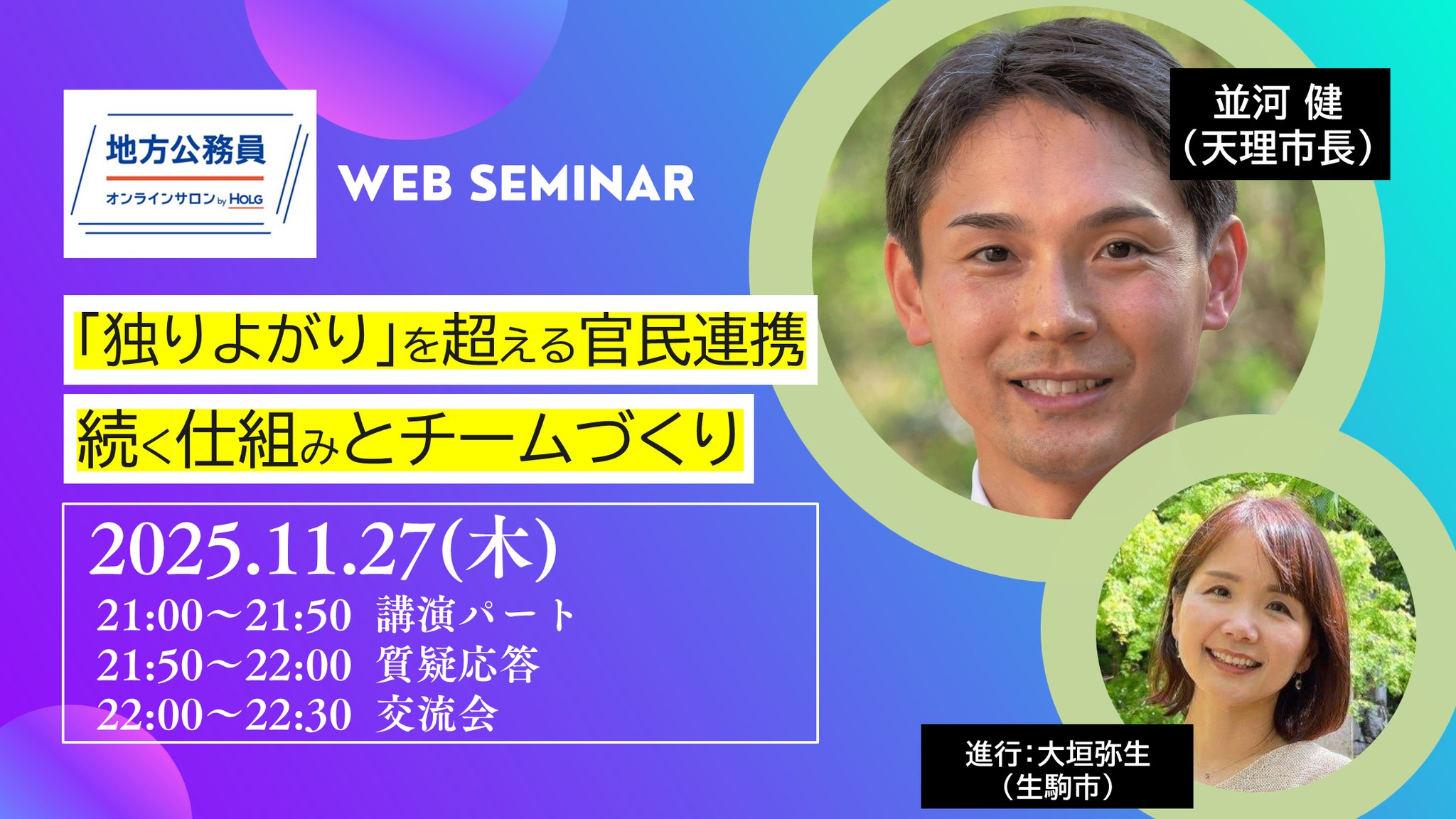本セミナーでは、官民連携の実践とそこから見えてきた課題や工夫について、並河市長が率直にお話しします。さらに、「前向き」な職員と「後ろ向き」な職員をどうやってチームにしていくか、市民や民間とどうすれば本当の意味で協働できるのか、現場からのリアルな経験を共有します。