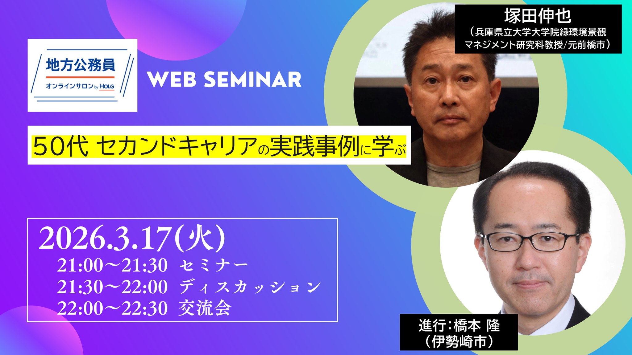 今回の「50代、セカンドキャリアの実践事例に学ぶ」セミナーでは、「公園」という特定の分野に特化して自分の専門性を極めた塚田伸也さん(元前橋市)から、前橋市でのご経験や兵庫県立大学に転職された経緯等を教えていただきます。