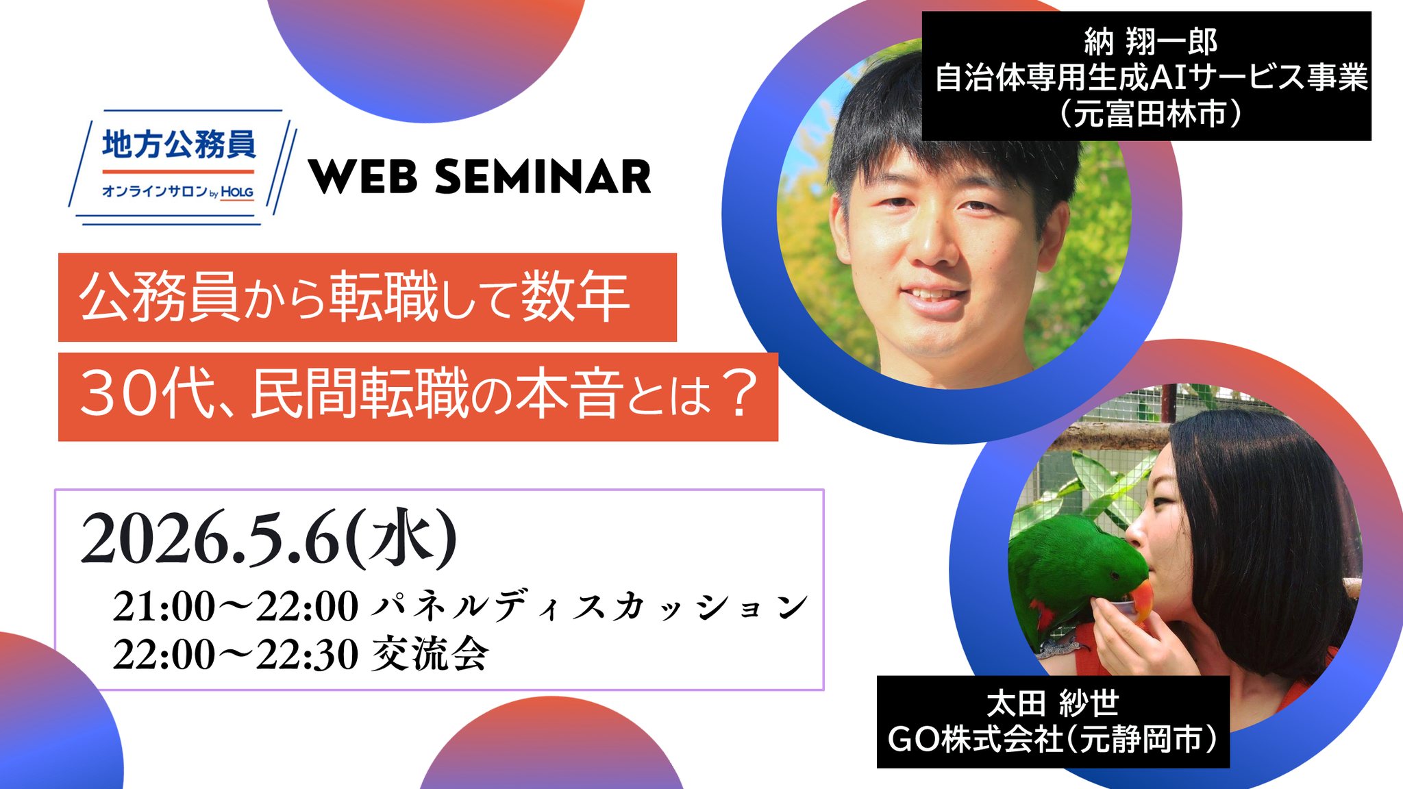 近年、多くの地方公務員が退職するケースが確実に増えています。そこで、本セミナーでは30代の元公務員のお二人をゲストにお招きし、これまでのキャリアから転職先の探し方についてリアルなお話を伺います。
